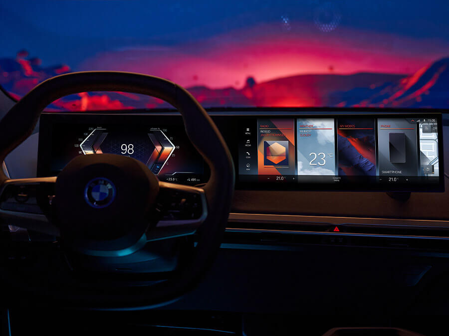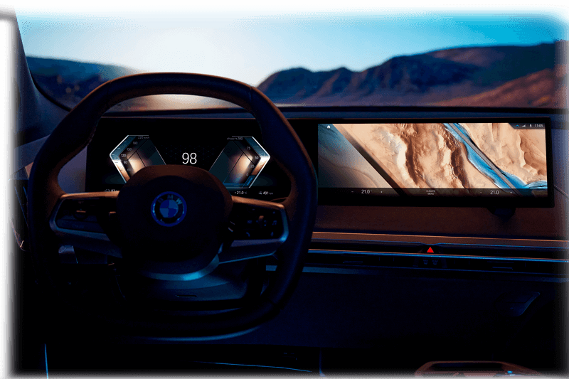 Pela primeira vez um veículo BMW irá ter um ecrã curvo: . O ecrã de informações de 12.9″ funde-se com o ecrã de controlos de 14,9″ para criar uma unidade única, criando a sensação de uma moldura de imagens flutuante no painel de instrumentos.